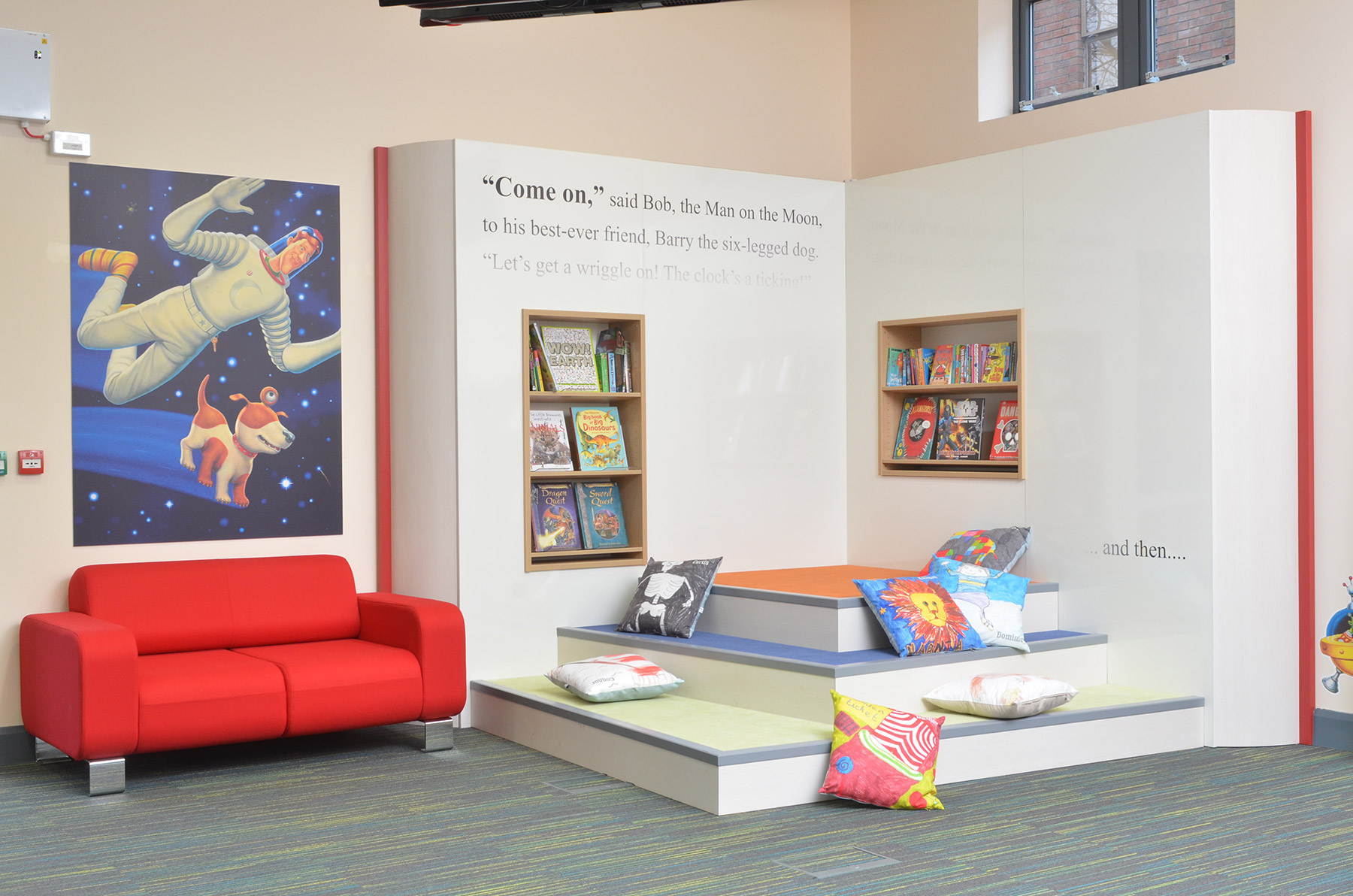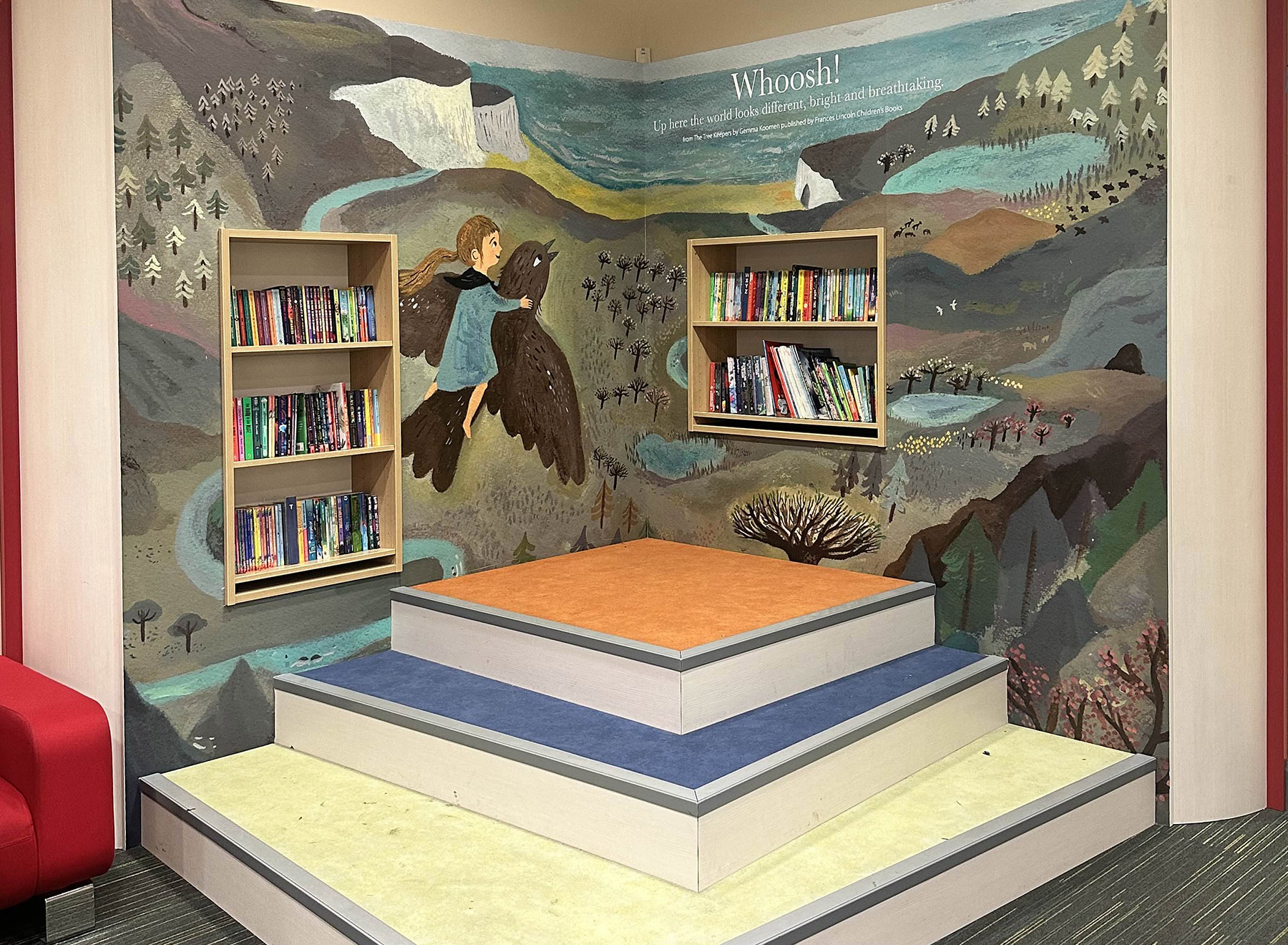 Gemma Koomen’s artwork was so popular, Gateshead Libraries commissioned Opening the Book to update the big book stage feature we installed in 2008 in the children’s library at Central Library.