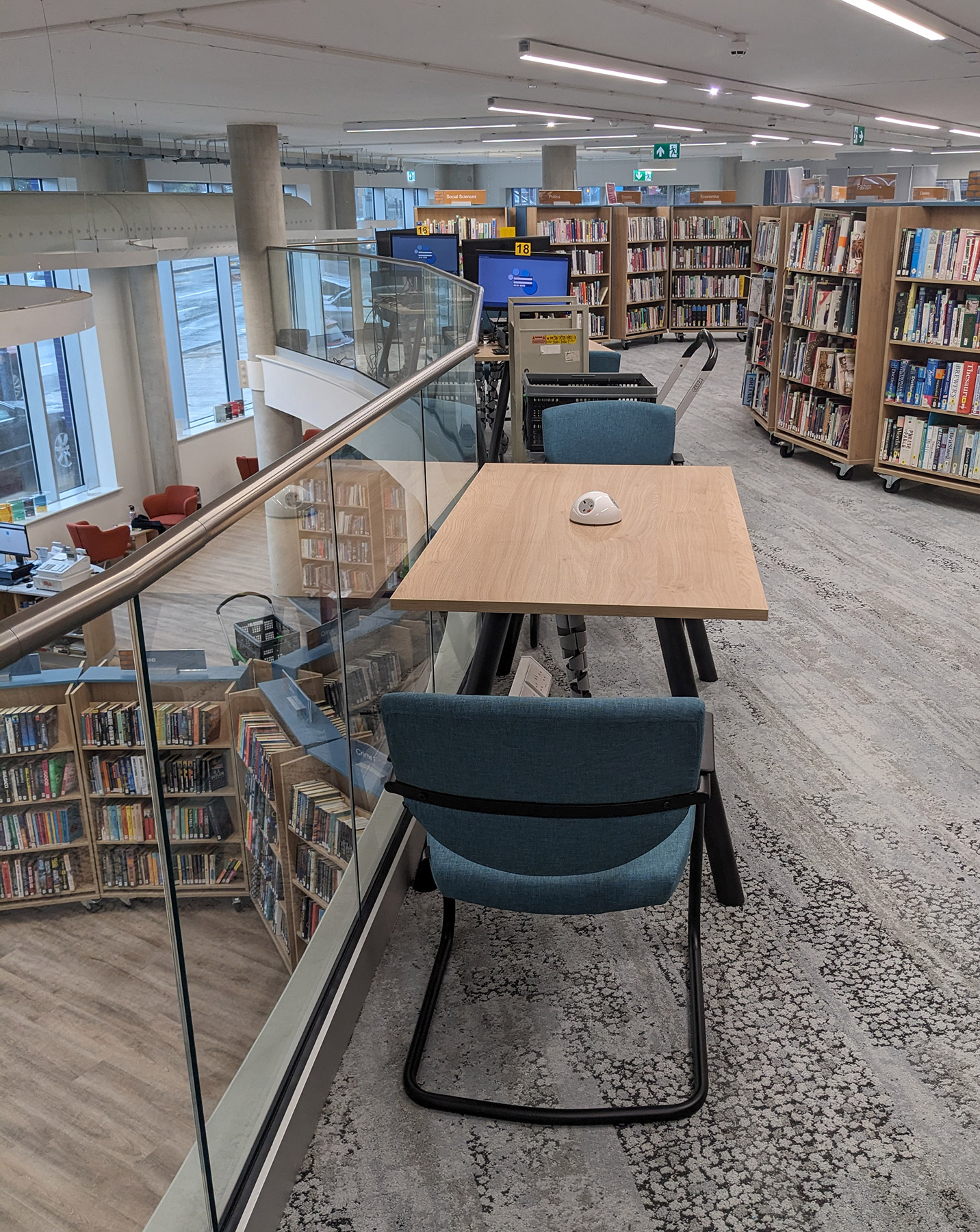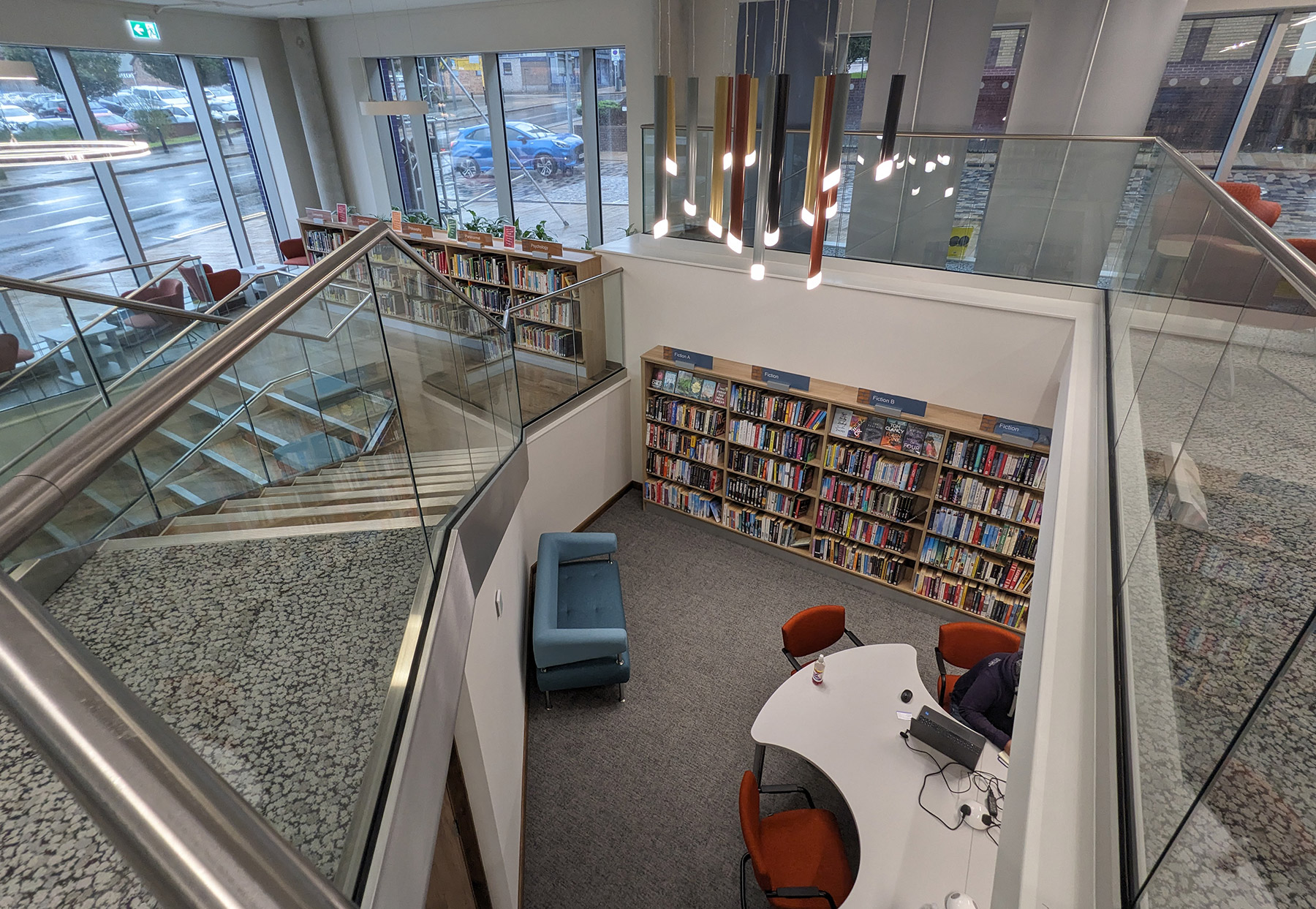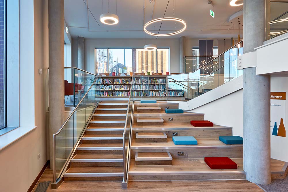 The building has an entrance at street level to the ground floor at the front and an entrance up a steep rise at the side to street level at the next floor. Unless library users were to move round the outside in all weathers, that meant internal stairs and lift must be added – space-hungry elements in a small footprint. BHB worked through lots of options to the final version where a lovely curved mezzanine expanded the capacity at the upper level and the attractive staircase doubles as seating. Opening the Book worked with the library team to maximise computer, bring-your-own-device and book capacity as each version evolved.