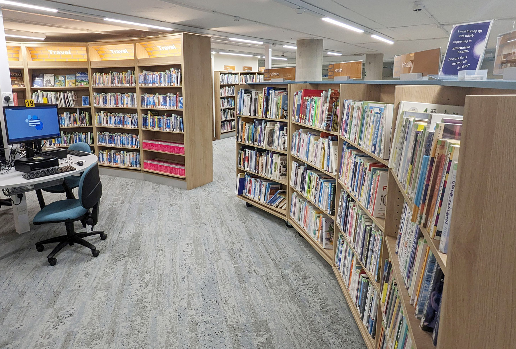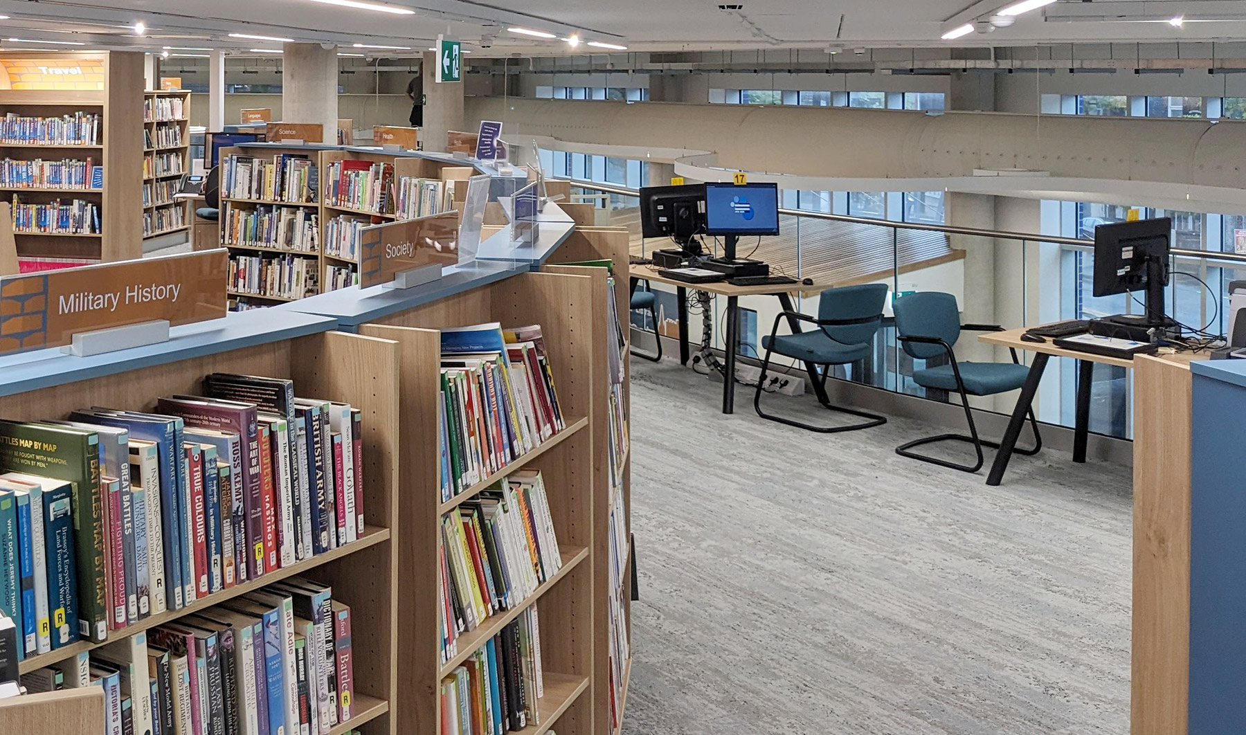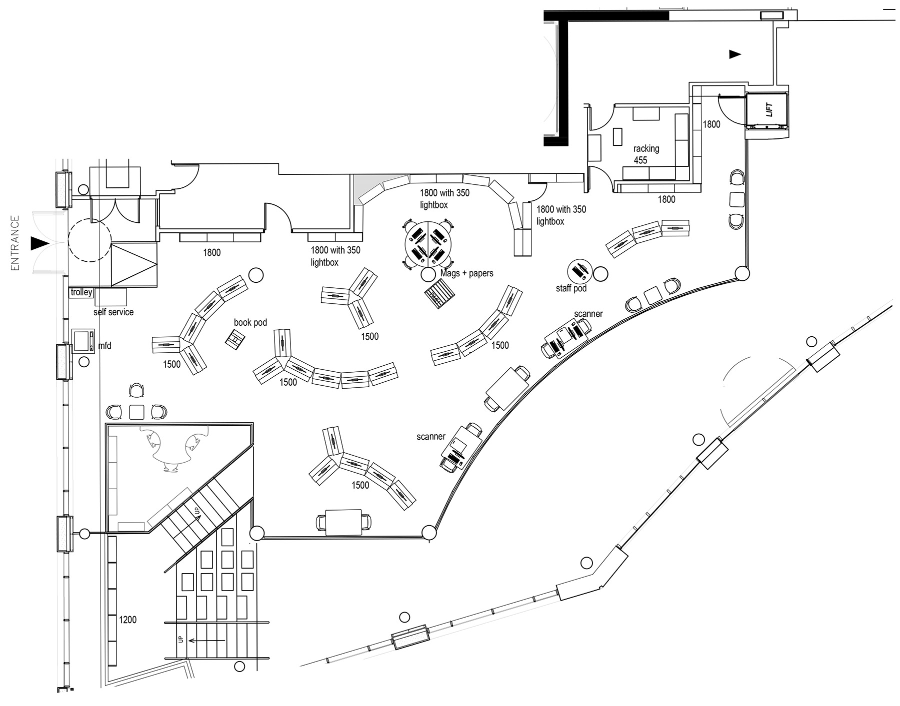 The building has an entrance at street level to the ground floor at the front and an entrance up a steep rise at the side to street level at the next floor. Unless library users were to move round the outside in all weathers, that meant internal stairs and lift must be added – space-hungry elements in a small footprint. BHB worked through lots of options to the final version where a lovely curved mezzanine expanded the capacity at the upper level and the attractive staircase doubles as seating. Opening the Book worked with the library team to maximise computer, bring-your-own-device and book capacity as each version evolved.