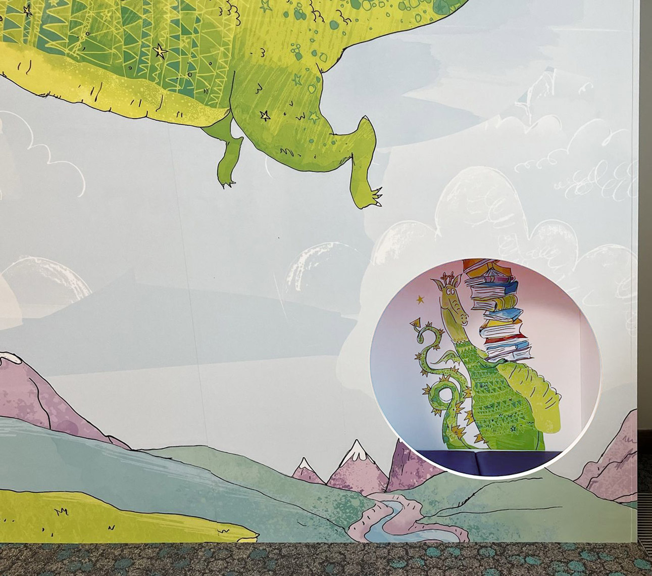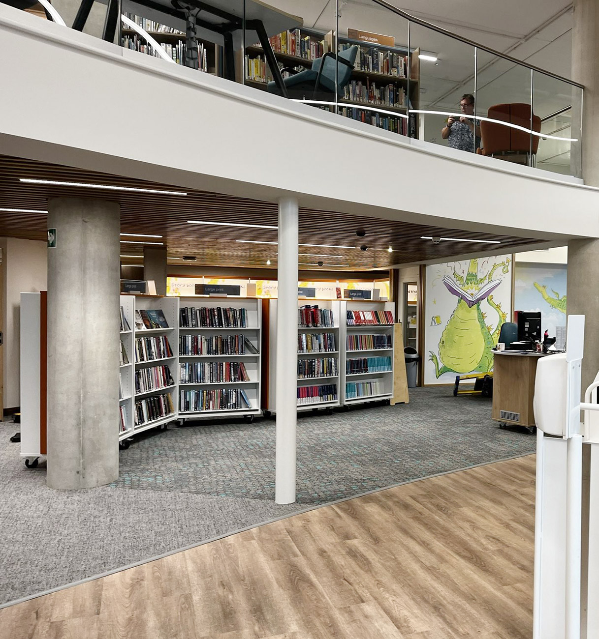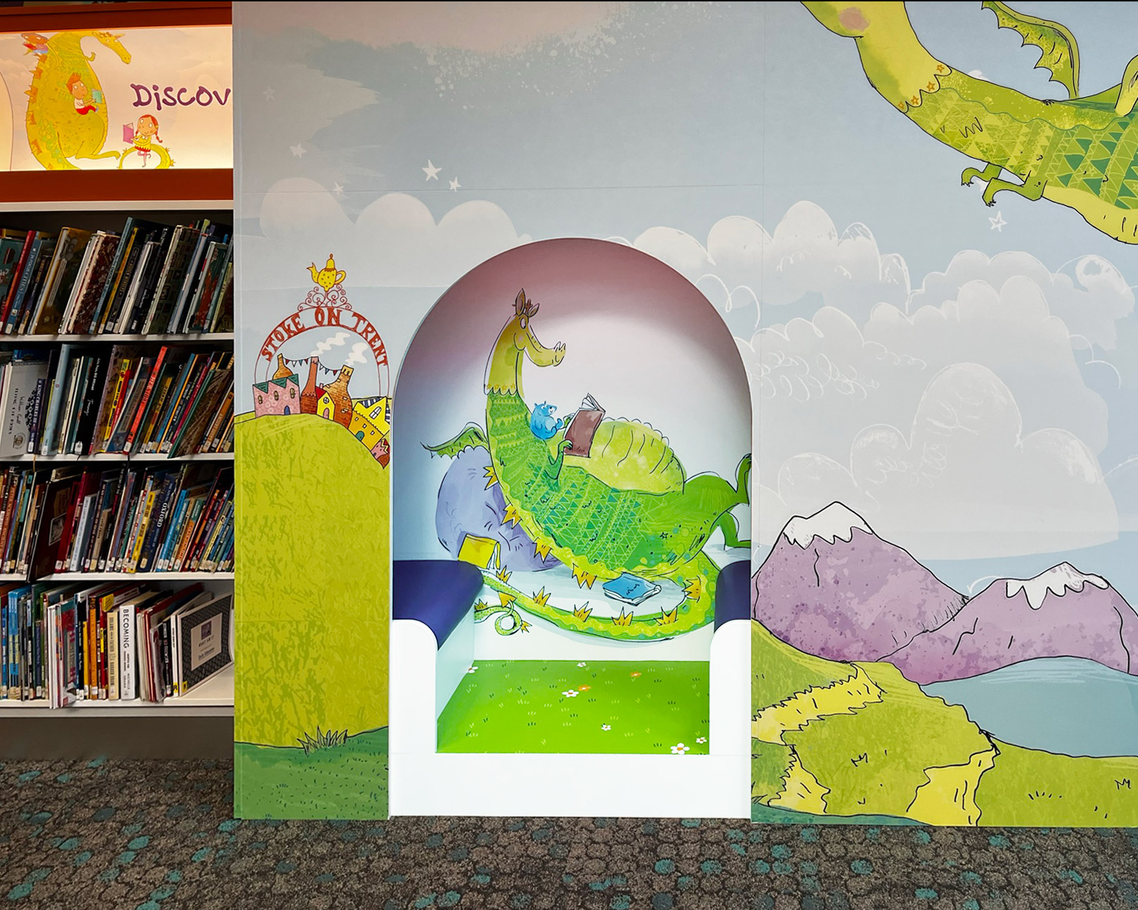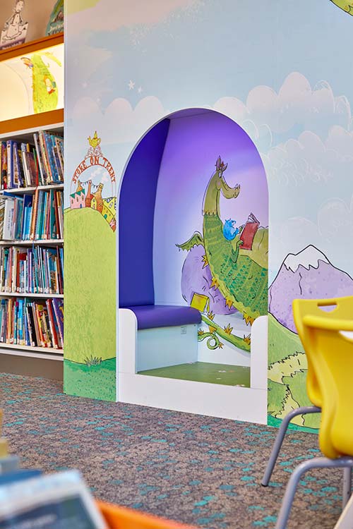 The children’s library was a vital component and we were fortunate that Stoke-on-Trent Libraries had already developed a relationship with children’s illustrator, Kate Leake. Kate’s dragon had become the children’s library brand, used on everything from library cards to event posters. Kate and the library team worked with us to adapt the flying dragon to appear on the outside and inside of our hideout feature. Plus there is a wonderful upright dragon announcing the children’s area which makes a feature of the utilitarian lift-shaft. We were delighted that Kate became the city’s first ever Creativity Laureate in January 2026.