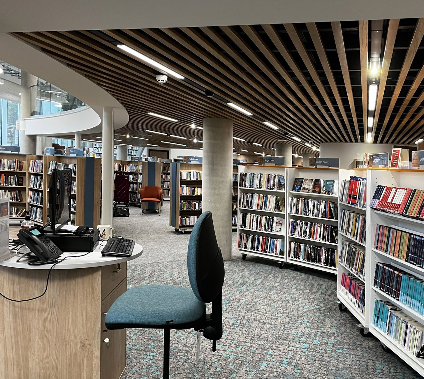 Moving a central library from an over-large 1970s building into a compact new home — 21 layout iterations, a curved mezzanine and ingenious space-planning for Stoke-on-Trent.