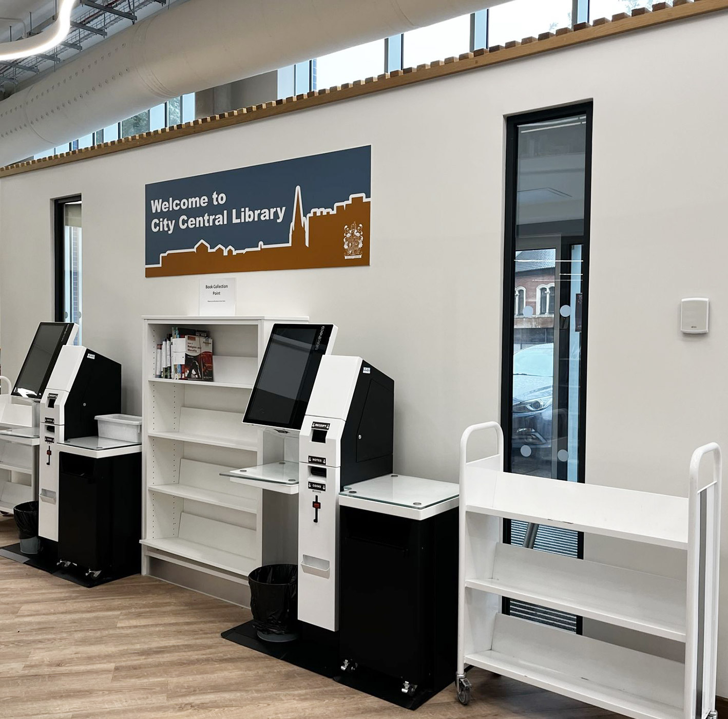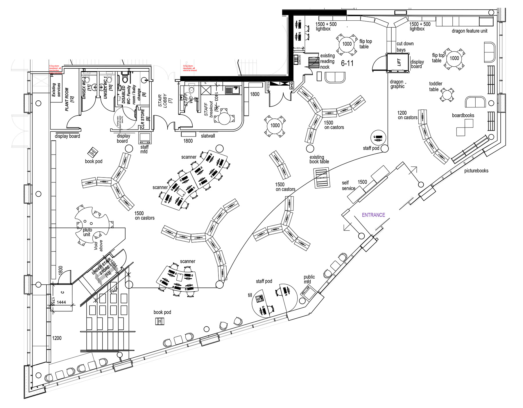 Opening the Book were brought in as consultants from the earliest concept development and worked with the architects, project managers, councillors and library managers in one continuous process right through to delivery. And it was a process – the challenge of moving a central library from a no-longer-fit-for-purpose space into a much tighter footprint took creativity and compromise from everyone involved. Options to connect to the public area of the council services offer next door were explored, including a shared café area, but had to be rethought to stay within a fixed budget. Locations for back office functions and an accessible toilet were juggled and the late addition of a front porch was then moved internal to save on cost. We eventually installed on Version 21 of our layout drawings!