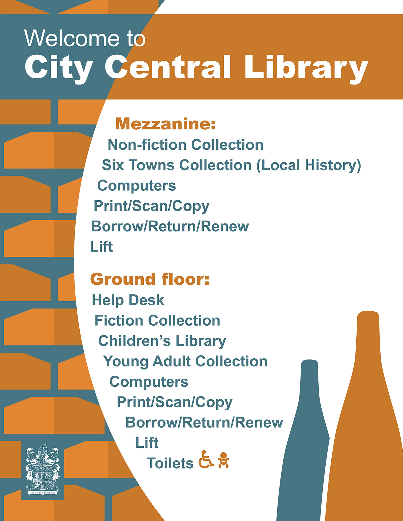 The dragon design also looks good on the children’s bookcase signage. For the adult signage, we developed a style which references the brick detail of the Smithfield building and the bottle kilns emblematic of the Potteries.