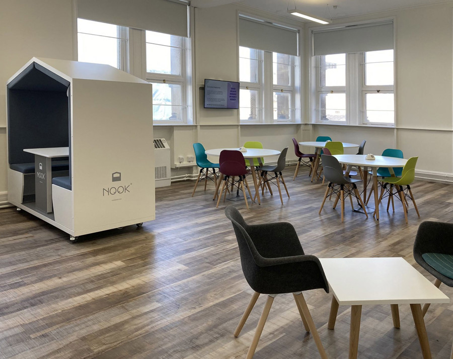 The smaller room next door has been converted into an agile space for co-working and small meetings as well as workshops like the current breakfast club. Laptops are provided for use, all tables have power and Nook Pods have new data connections as well as power. A wall-mounted screen is convenient for shared presentation and learning. A further small room houses fixed computers with large screens for complex work or to share for tutorials or working together.