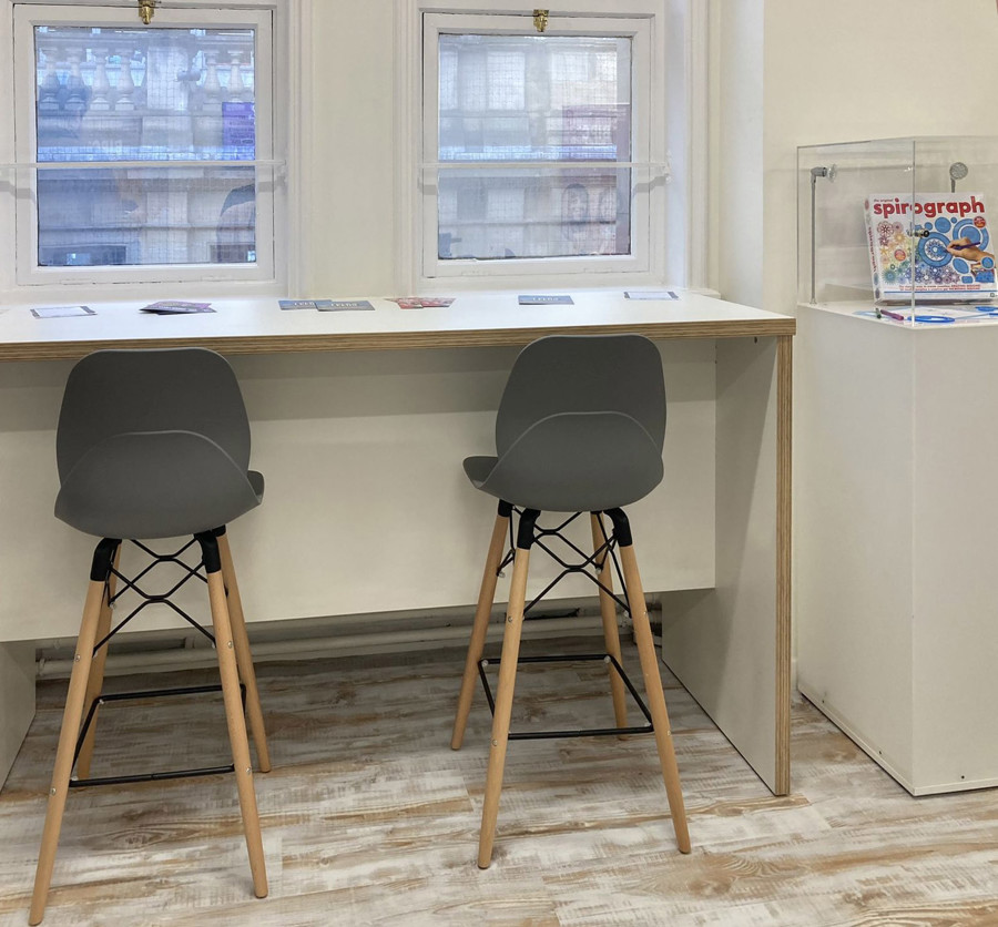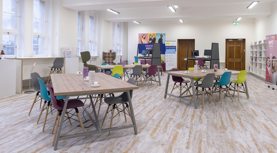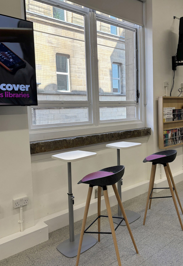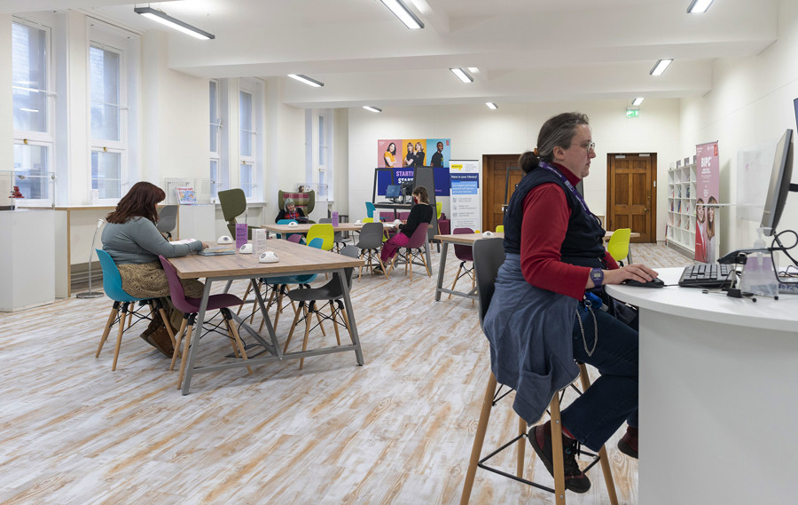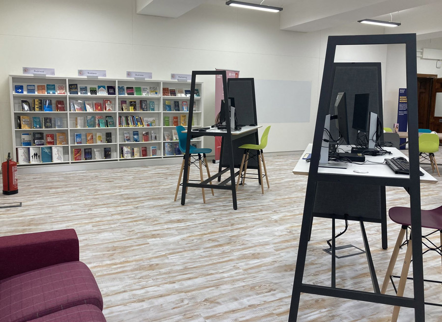 The old information library has become a light and airy space with a dynamic ambience similar to commercial co-working tech spaces but with free access to business resources and staff support. The layout makes the most of the large windows and mixes Creator tables, designed by Opening the Book, with window benches and A-frame sit-stand tables, to offer a variety of styles for study, research and informal networking, plus high-back seats and comfortable sofas to take a break. There is access to power everywhere with fixed pcs for database searching and power units for bring-your-own-device. The space is completed with new shelving and slatwall for business books, magazines and leaflets plus space for graphics, displays and secure cabinets to showcase the work of successful local businesses who have used the facilities. Streamed presentations for 30 people take place without moving any furniture; we also fitted in a fully-equipped private meeting room for up to 10 people and two smaller confidential one-to-one meeting pods.