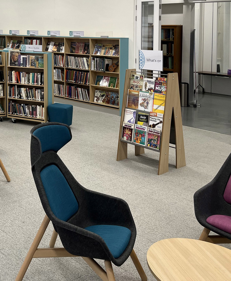 We worked closely with library managers and the Music Librarian to plan how to showcase the collection of the largest music library in the north of England, including musical biographies, guidebooks, songbooks, sheet music and much more. Lending of multiple sets of vocal and orchestral scores to music societies has expanded to create an offer across the country. Custom deep shelving for large scores in the smaller rooms shows the range available as single titles, with tables to pull out the large volumes to look at; once a decision is made on which set to borrow, a request is put in so that multiple copies can be collected.