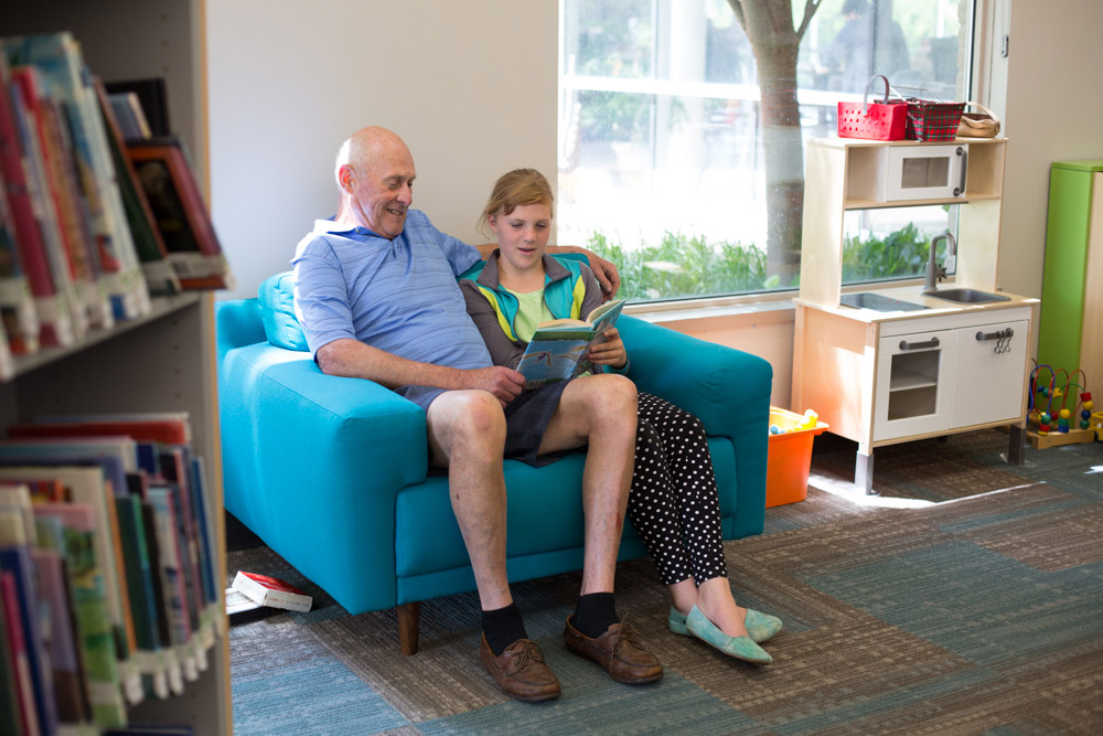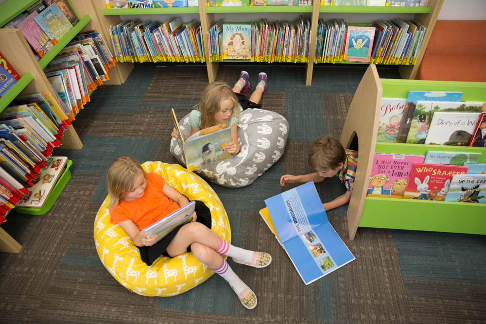 Opening the Book were appointed to design the library interior and built creative partnerships with everyone involved – the library team, the Board, the architect, the local community. Everyone bought into the concept of discovery layout. Out went straight rows of shelving and in came Opening the Book’s propeller and arc shapes to open up the sightlines and bring a dynamic flow to the space, while still respecting the symmetry of the building.