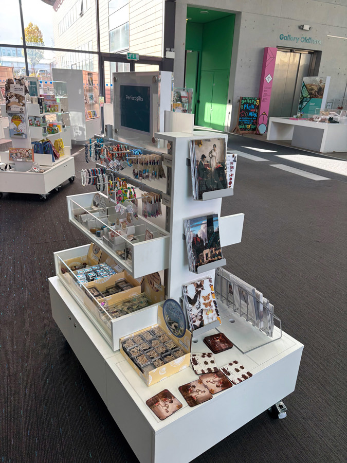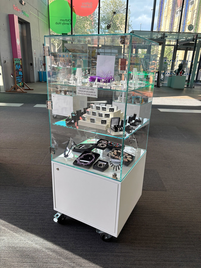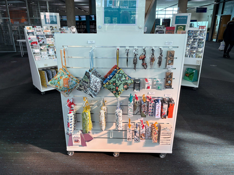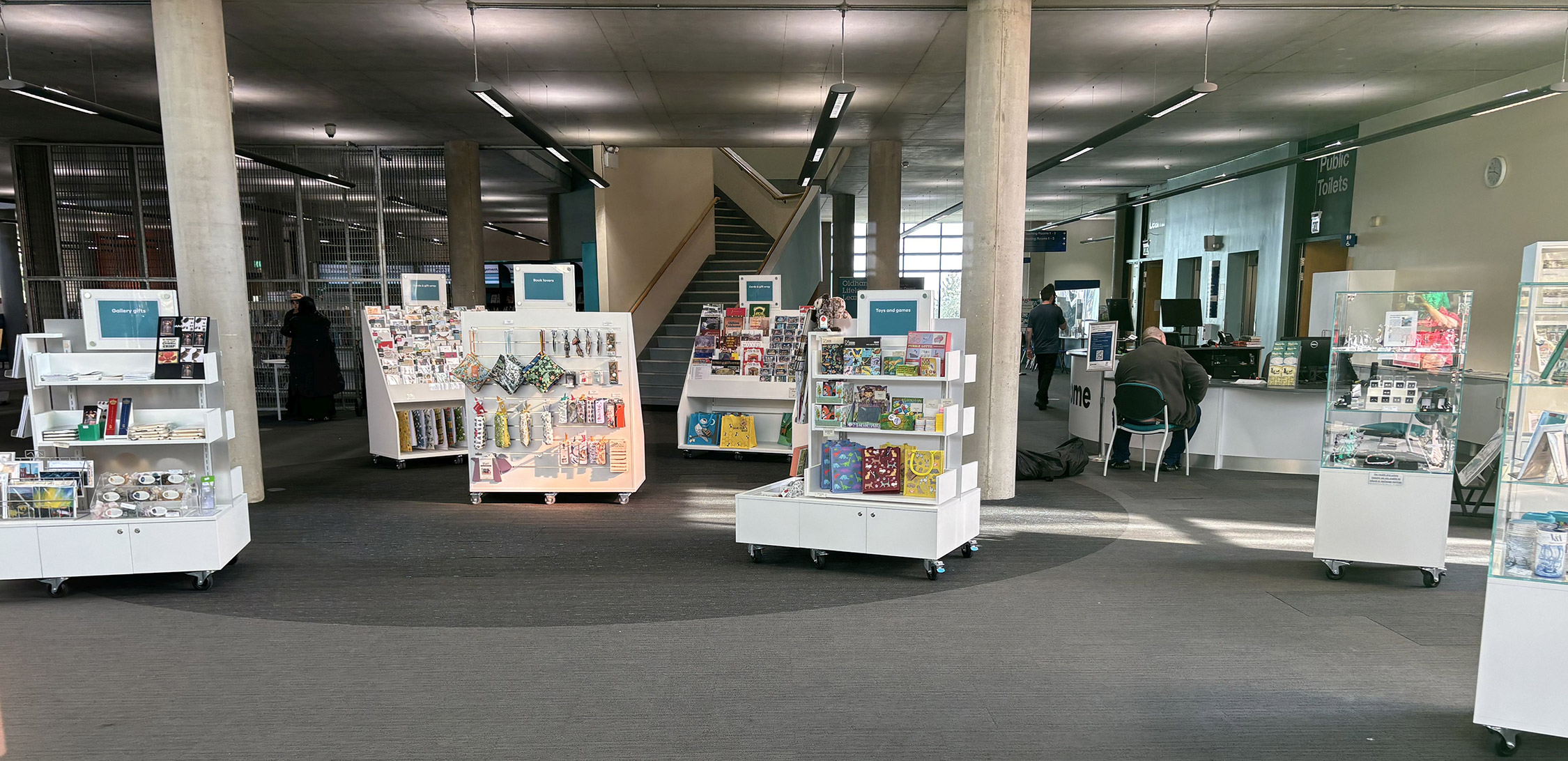 Opening the Book worked closely with our manufacturing partner, Astabridge, to design, prototype, test and refine bespoke units. Astabridge specialises in display solutions and their clients include high-end beauty firms creating displays at Selfridges, Heathrow Airport and Harrods. Working in glass and white laminate, we developed custom display cabinets, balancing quality, flexible merchandising and mobility. Everything was agreed with the library staff who manage the shop as they planned their revitalised offer of cards, gifts, crafts, jewellery, prints and unique products from local artists. The quality of both the layout positioning and the individual units can be seen in the photographs. Costs were saved by re-using the existing counter and self-service housing, with Nick Hurst, our skilled joiner, making them look as if they had always fitted there and CV, our graphics partner, wrapping the old turquoise colour scheme in white to match the new look.