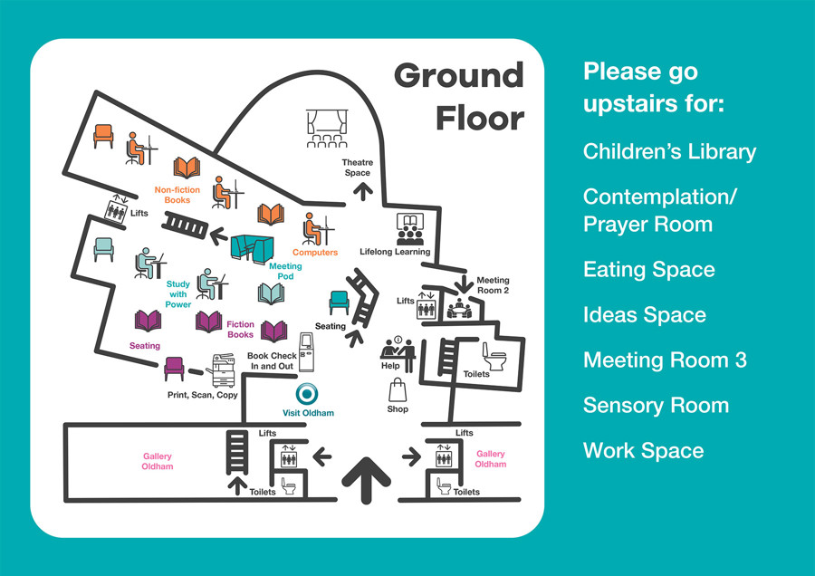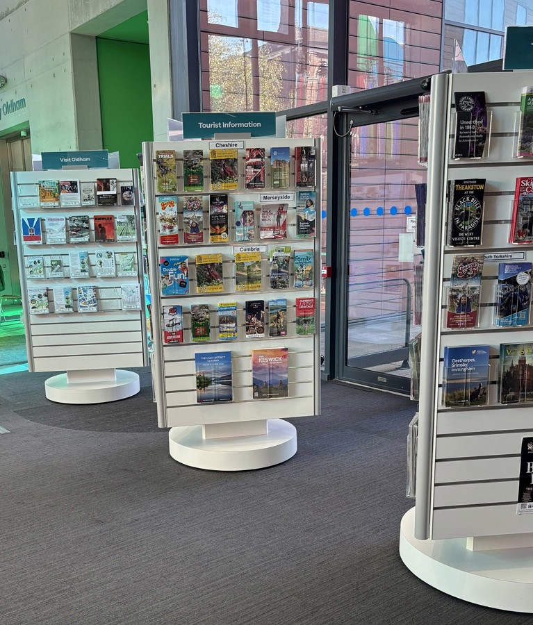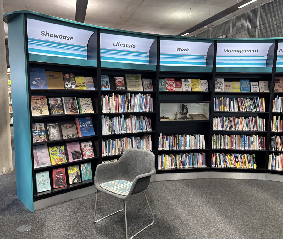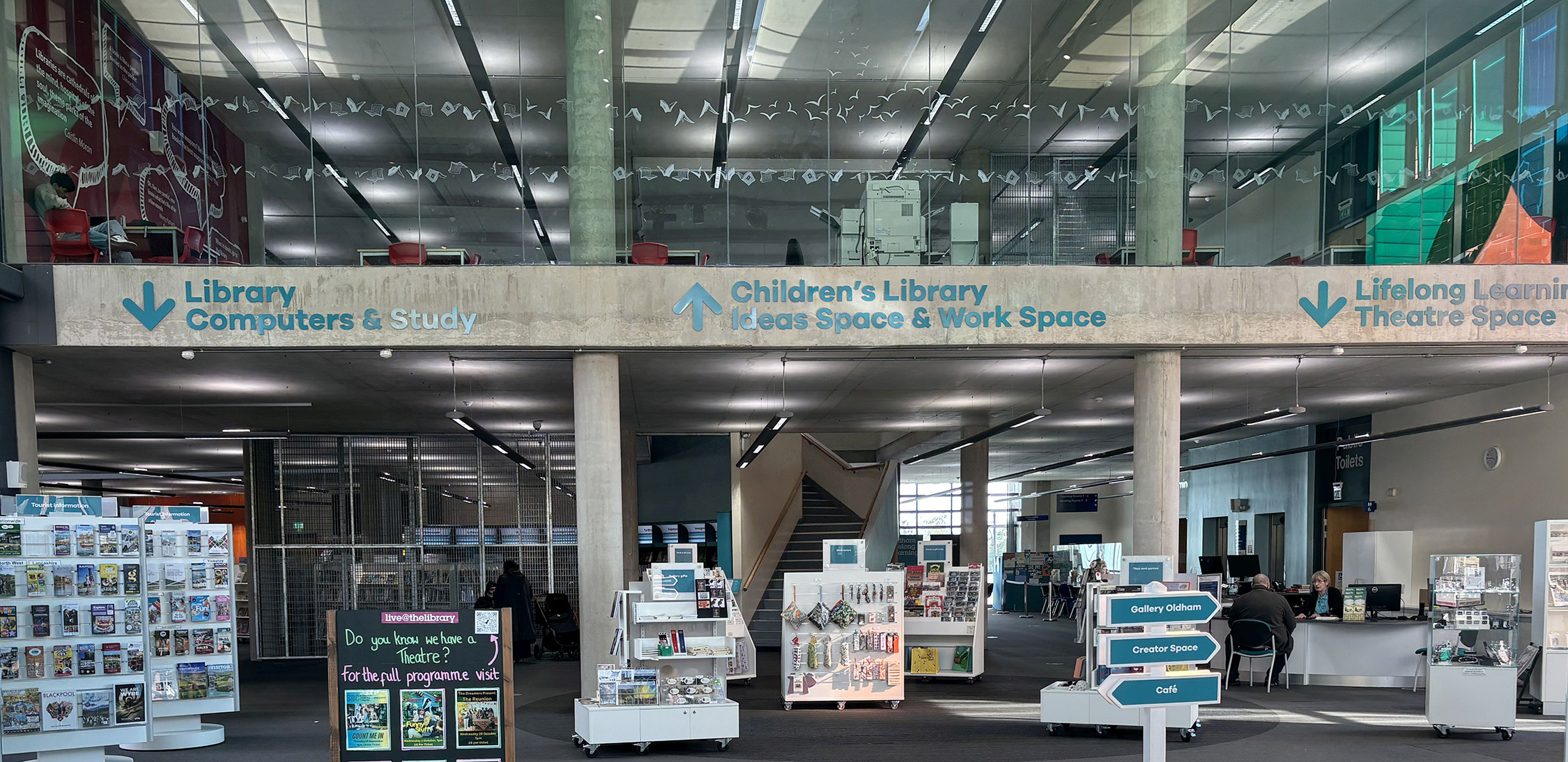 Oldham Library is a delightful building but it is not easy to know where to go. Opening the Book’s design combined large scale signage on concrete lintels with eye-level stands at key points in the customer journey.