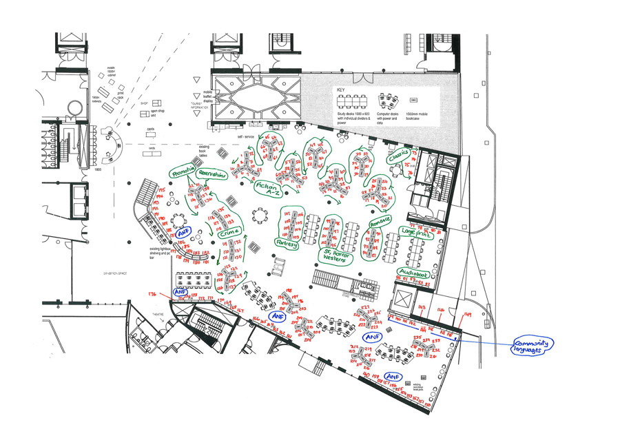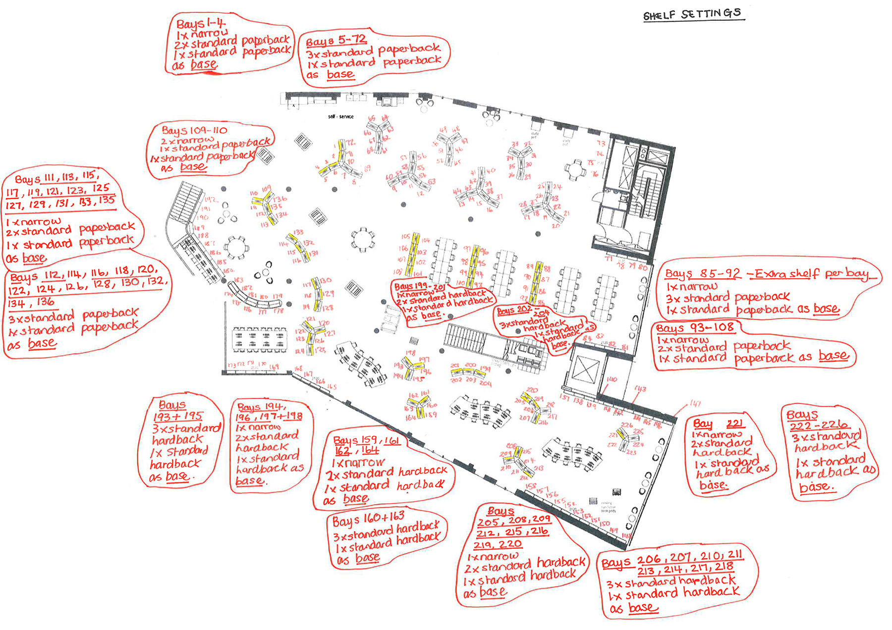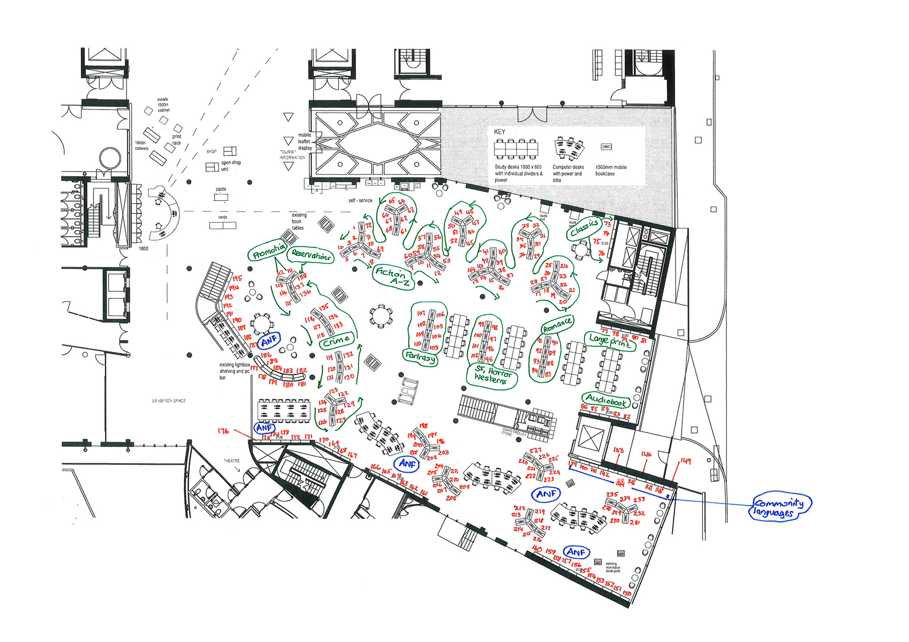 Oldham Library managers and staff have a great approach to managing the stock into the available space and working towards performance and not storage. Opening the Book worked in detail with the library team to plan how every bookcase would be used. Below are two stages in the process. The details kept changing right up to the library opening! Because the bookcases are mobile, and the shelves and merchandising acrylics are all interchangeable, this layout can easily be changed in the future to adjust to new needs.