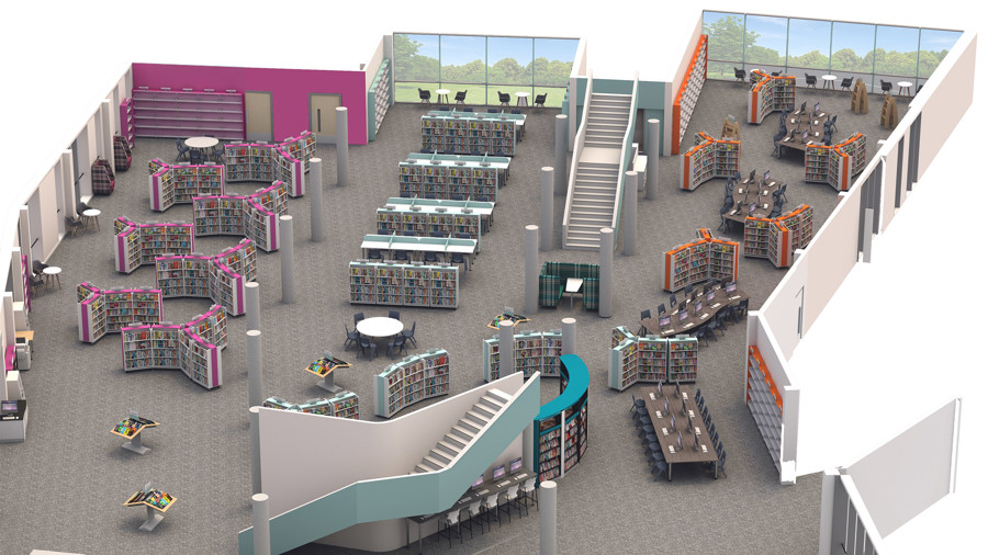 When you stand looking in, the computer desks at the right are curved in dark oak while the byod desks are straight in glacier blue and white. The shelving in the middle section is straight like the desks. The main fiction browsing area to the left has dynamic propeller shapes to keep customers bouncing on from one bookcase to another.