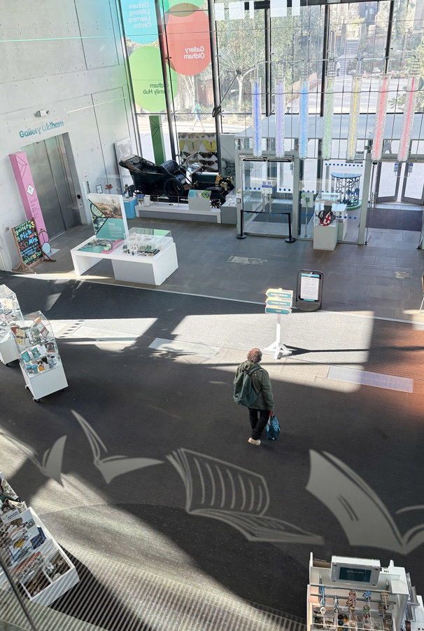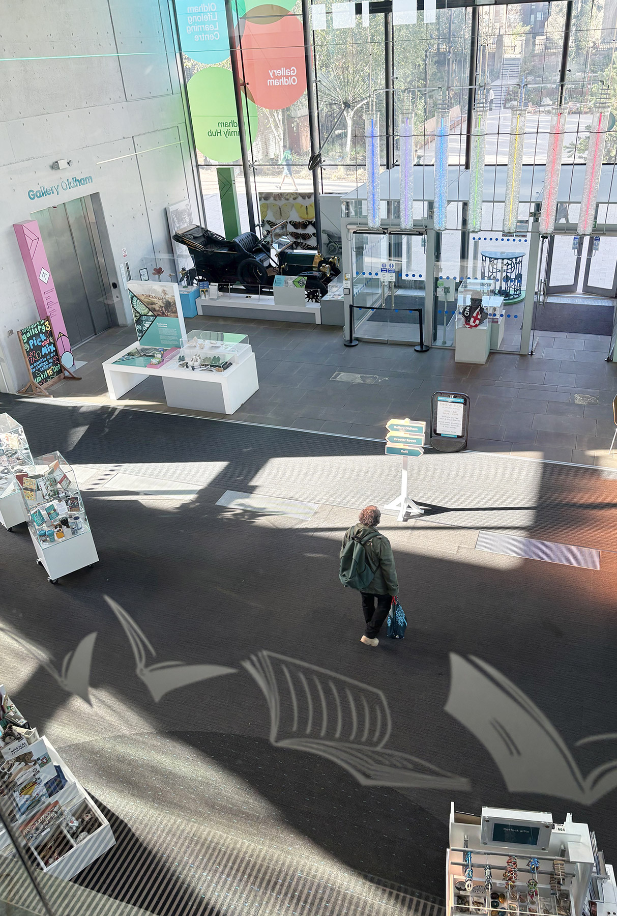 The large double-height glazed atrium at the entrance felt both cavernous and confusing, with a medley of offers dominated by a large reception desk installed in 2014 to replace the even larger one the building was originally provided with. Opening the Book cut the counter down in size and moved it to the side so it no longer acts as a barrier to entering the space. This opened up better sightlines to see the routes through to travel further into the building. It also created more space for shop units with close-up product offers to tempt everyone passing. But before you think that’s solved everything, a further requirement was that all the units in the atrium area had to be moveable. The space is successfully used for large events and the target of increasing income from the shop could not be allowed to clash with the popularity of big fairs and dance performances.
