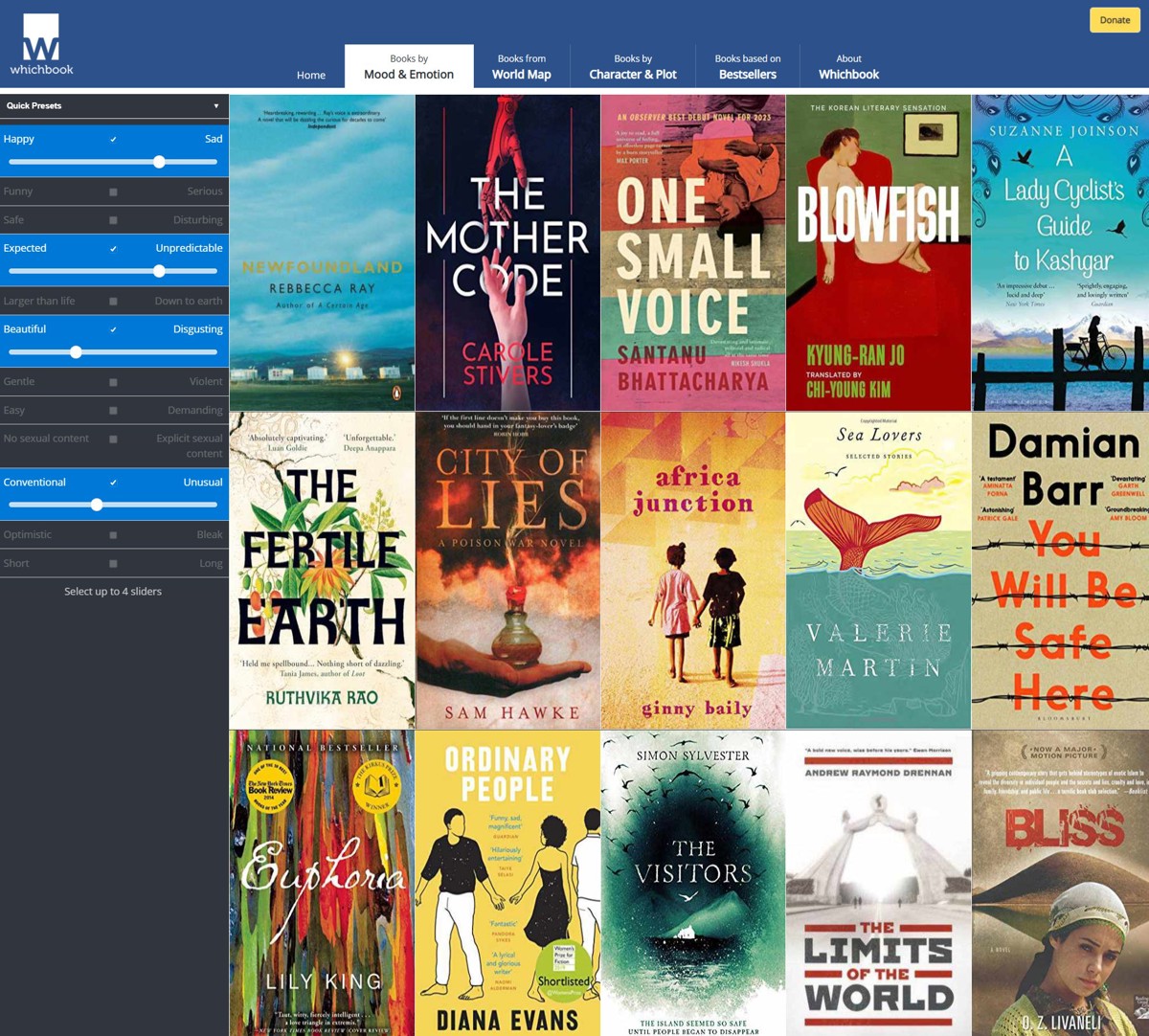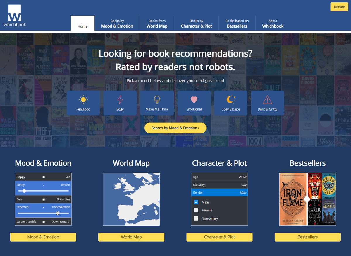 Whichbook is a free book discovery website that helps you find your next great read in a completely different way. Instead of searching by title or author, you choose by mood, emotion, character type, plot style — or even the part of the world you’d like to read about.